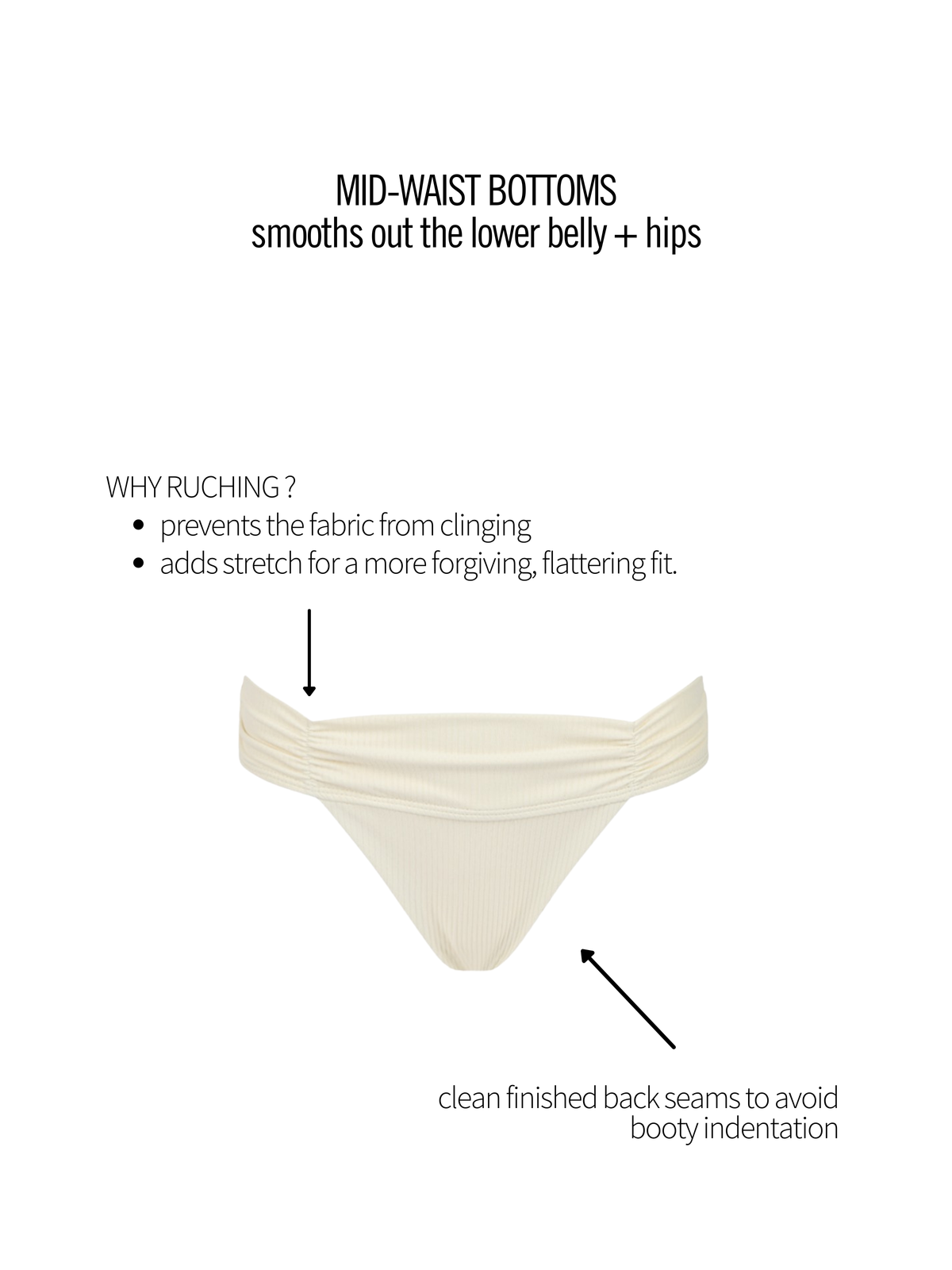 Comfort collides with confidence, these ruched bottoms are held up with a generous mid-rise waistband to smooth and flatter curves.