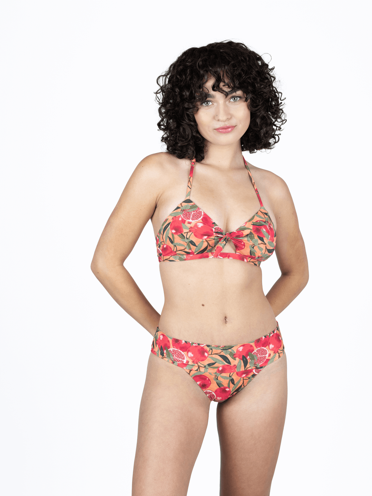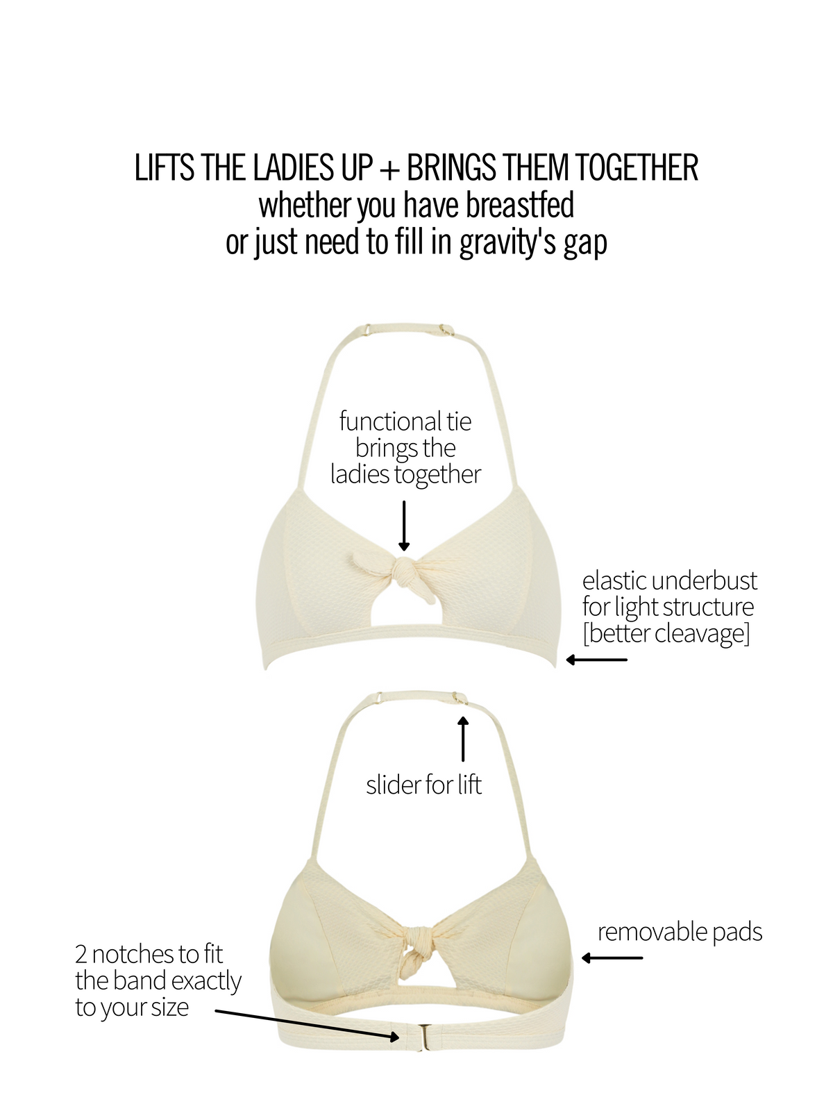 A chic top, tied up with a knot — sure to make a splash. 3 ways to adjust: front tie, halter, and back clasp, for a very personalized fit.